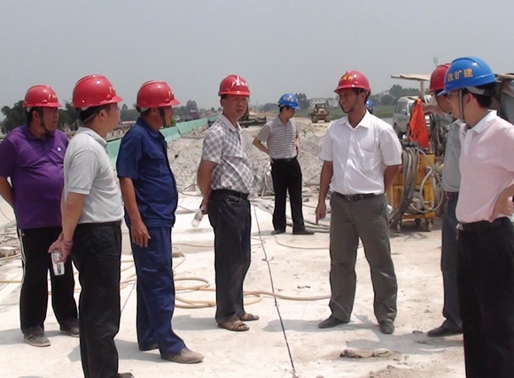 圖為李總經(jīng)理(左四)在舊橋破碎施工現(xiàn)場指導(dǎo)工作