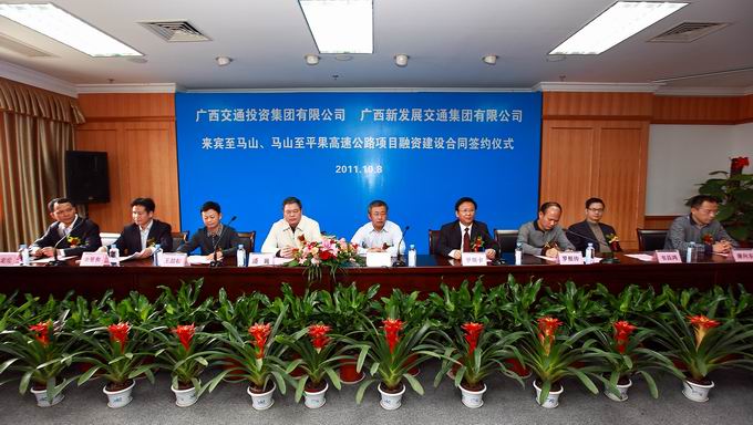 10月8日,集團公司和廣西交通投資集團公司來賓至馬山、馬山至平果高速公路項目融資建設合同簽約儀式在南寧舉行。自治區(qū)交通運輸廳廳長潘巍、總工程師王劼耘;集團公司董事長、黨委書記朱堅和,總經(jīng)理李定倫,黨委副書記、紀委書記張友坐,副總經(jīng)理劉明洪,總會計師鄧遠志,總工程師覃炳賢;交投集團副董事長、總經(jīng)理、黨委副書記劉可,黨委副書記、紀委書記羅斯卡,副總經(jīng)理韋昌鴻、廉向東,及雙方有關部門、直屬各單位負責人參加了簽約儀式。